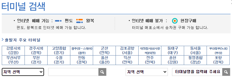 시외버스의 경우 인터넷 예매가 되지 않고 현장 구매만 가능 한 곳들이 있기 때문에 꼭 체크해 보시기를 바랍니다.