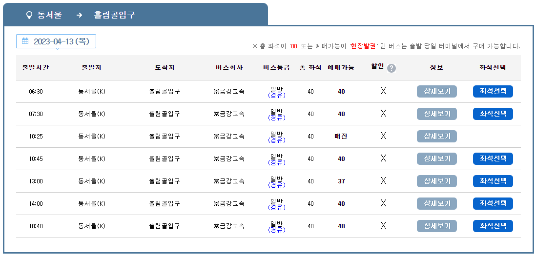 출발지는 지역명이나 가나다 순서, 혹은 직접 입력하셔도 됩니다. 출발지를 선택하면 예매가능한 도착지가 보여지는데 여기에서 현장 예매만 가능한 곳까지 확인이 됩니다.