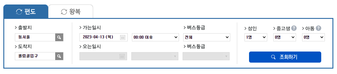 날짜와 출발도착지를 선택한 이후 시간표 조회를 하시면 됩니다. 조회하기를 클릭하시면 해당 하는 날짜의 버스시간표와 좌석선택 창이 뜹니다.