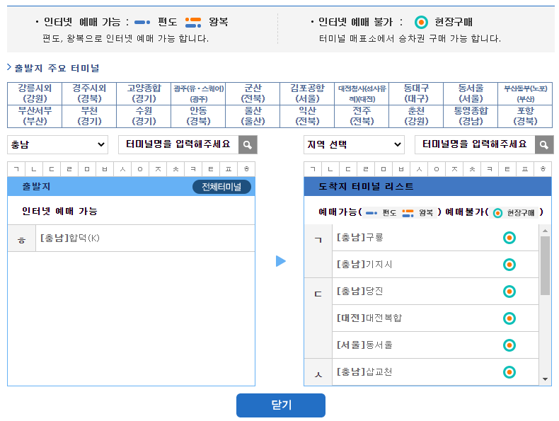 위의 사진을 보시면 해당하는 터미널에서 도착이 가능한 터미널의 리스트가 나오고 인터넷 버스예매가 가능한지 여부도 확인이 됩니다. 현장구매만 가능 한 곳도 있으니 참고 하세요.