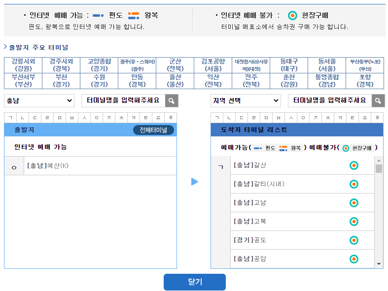 출발지는 지역명이나 가나다 순서, 혹은 직접 입력하셔도 됩니다. 출발지를 선택하면 예매가능한 도착지가 보여지는데 여기에서 현장 예매만 가능한 곳까지 확인이 됩니다.