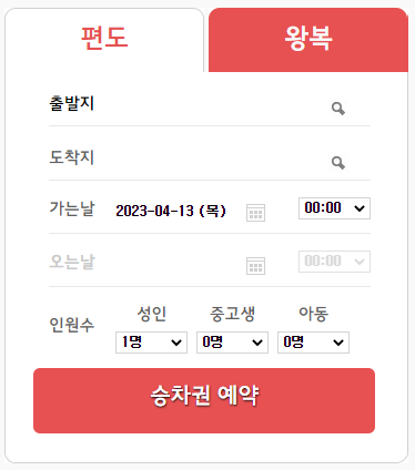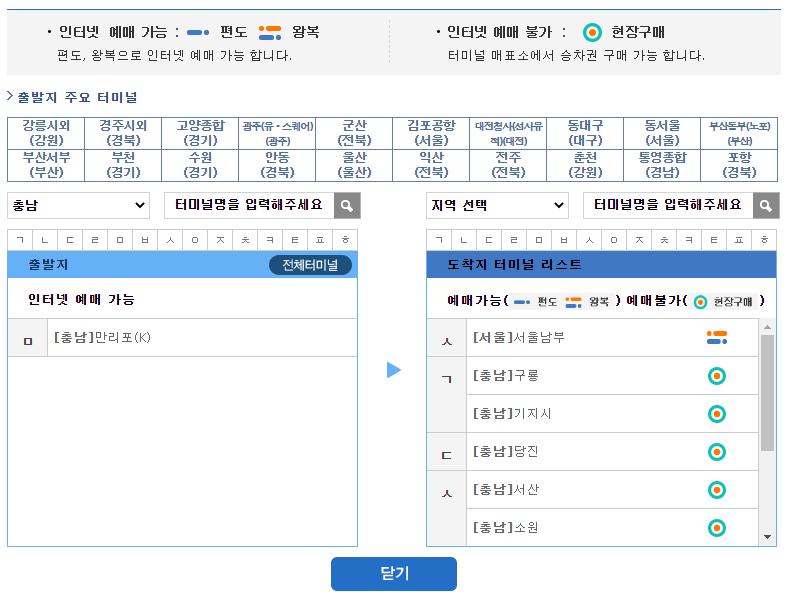 출발지는 지역명이나 가나다 순서, 혹은 직접 입력하셔도 됩니다. 출발지를 선택하면 예매가능한 도착지가 보여지는데 여기에서 현장 예매만 가능한 곳까지 확인이 됩니다.