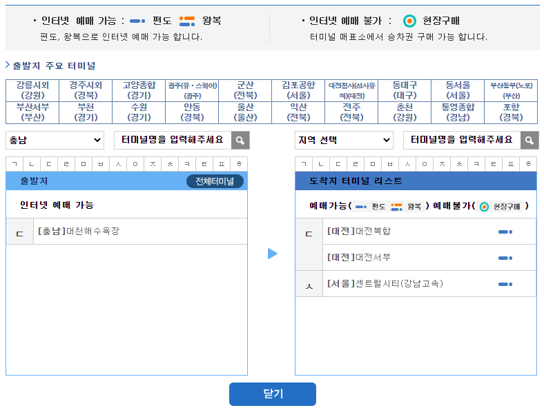 출발지는 지역명이나 가나다 순서, 혹은 직접 입력하셔도 됩니다. 출발지를 선택하면 예매가능한 도착지가 보여지는데 여기에서 현장 예매만 가능한 곳까지 확인이 됩니다.