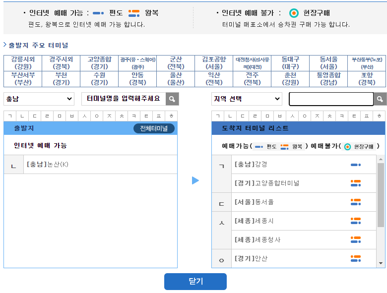 출발지는 지역명이나 가나다 순서, 혹은 직접 입력하셔도 됩니다. 출발지를 선택하면 예매가능한 도착지가 보여지는데 여기에서 현장 예매만 가능한 곳까지 확인이 됩니다.
