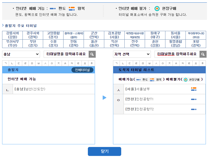 출발지는 지역명이나 가나다 순서, 혹은 직접 입력하셔도 됩니다. 출발지를 선택하면 예매가능한 도착지가 보여지는데 여기에서 현장 예매만 가능한 곳까지 확인이 됩니다.