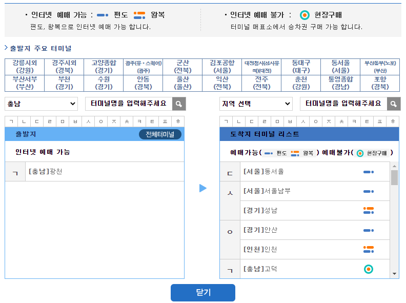 출발지는 지역명이나 가나다 순서, 혹은 직접 입력하셔도 됩니다. 출발지를 선택하면 예매가능한 도착지가 보여지는데 여기에서 현장 예매만 가능한 곳까지 확인이 됩니다.
