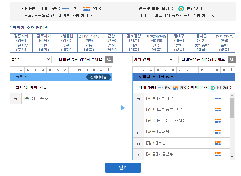 출발지는 지역명이나 가나다 순서, 혹은 직접 입력하셔도 됩니다. 출발지를 선택하면 예매가능한 도착지가 보여지는데 여기에서 현장 예매만 가능한 곳까지 확인이 됩니다.